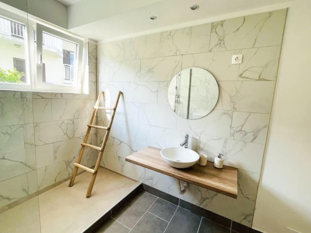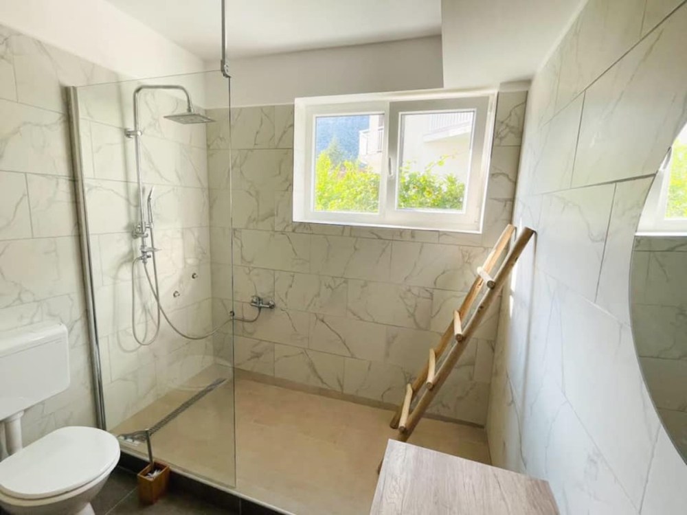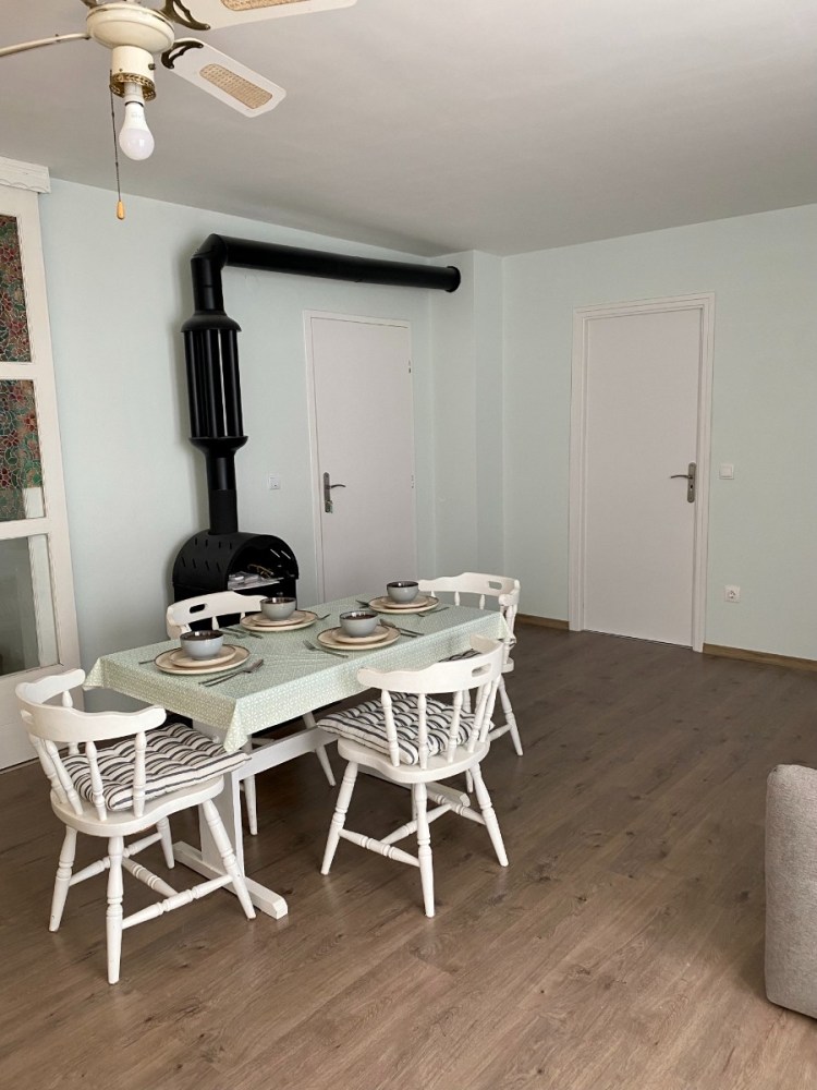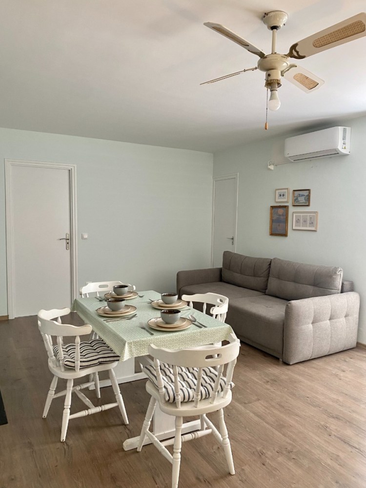 Az első félemeleten található a ház két apartmanja közül az első. Az összesen 60 m2-es apartman két tágas szobával rendelkezik, az egyikben egy franciaágy, a másikban emeletes ágy helyezkedik el. A hívogató nappali helyiség az étkezőasztallal, amellett, hogy közösségi térként funkcionál, a kihúzható kanapéjával további két főnek ad kényelmes fekhelyet. A teakonyhában nem csak reggelit, hanem a főétkezés ételeit is el lehet készíteni. A modern és tágas, 8 m2-es fürdőszoba a folyosóról nyílik. Az apartman különlegessége a hatalmas, 40 m2 területű terasz, ahol a kerti ülőgarnitúrán mindenki kényelembe helyezheti magát.